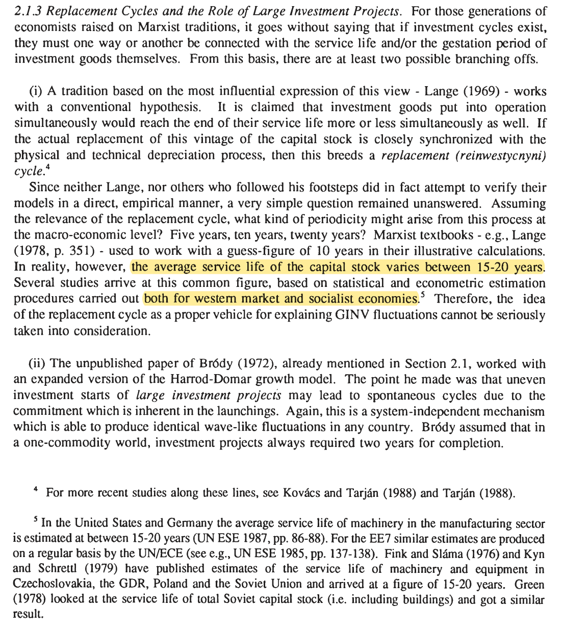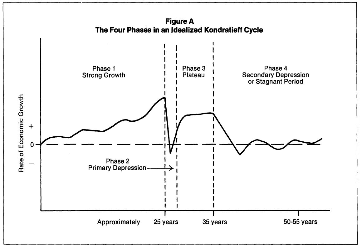 Ernest Mandel, dans son ouvrage Long waves of capitalist development, est de l’opinion que les grandes vagues d’investissement ne se déclenchent pas suite à l’usure de l’infrastructure et de l’équipement de la vague précédente : ‘aucun des éléments majeurs du capital fixe ne dure 20 ou 30 ans (à l’exception des bâtiments et des chemins de fer, lesquels n’ont joué aucun rôle d’importance dans l’investissement depuis plus d’un siècle)’. S’il reconnaît la possibilité d’un impact de l’innovation technologique, cette dernière ne peut exprimer tout son potentiel qu’avec la mise au pas de la classe travailleuse : la part des salaires dans les richesses produites doit être suffisamment faible pour que les profits escomptés suscitent la vague d’investissement en question. Andreas Malm, dans Long Waves of Fossil Development: Periodizing Energy and Capital, appuie sur la transformation de l’infrastructure énergétique accompagnant chaque nouveau cycle, à l’exception notable du dernier (c’est notamment la désindustrialisation et le large transfert de la production vers l’Asie qui permet alors de faire céder les travailleurs occidentaux ).
