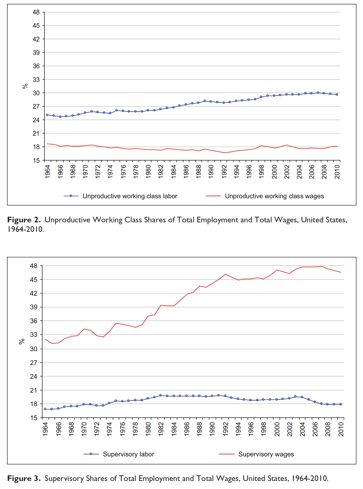 Les faibles gains de productivité dans ces activités « non-productives » (de valeur) est (ou fut) une cause majeure de leur expansion➤, à quoi il faut ajouter une mondialisation qui s’accélère à partir des années 1970 – contribuant possiblement à éviter une concentration du capital pour cause de taux de profit en berne (et donc un moindre recours aux services commerciaux ?). Les ordinateurs➤ et internet auront certainement permis de remédier en partie à ce grignotage de la plus-value par le commerce et la supervision.