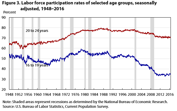 Mais la récession de 1973-75 ne pousse pas à entrer (ou rester) sur le marché du travail.