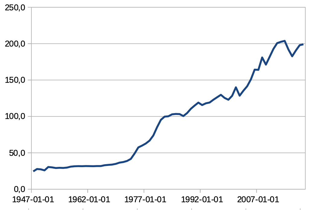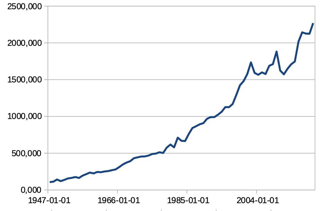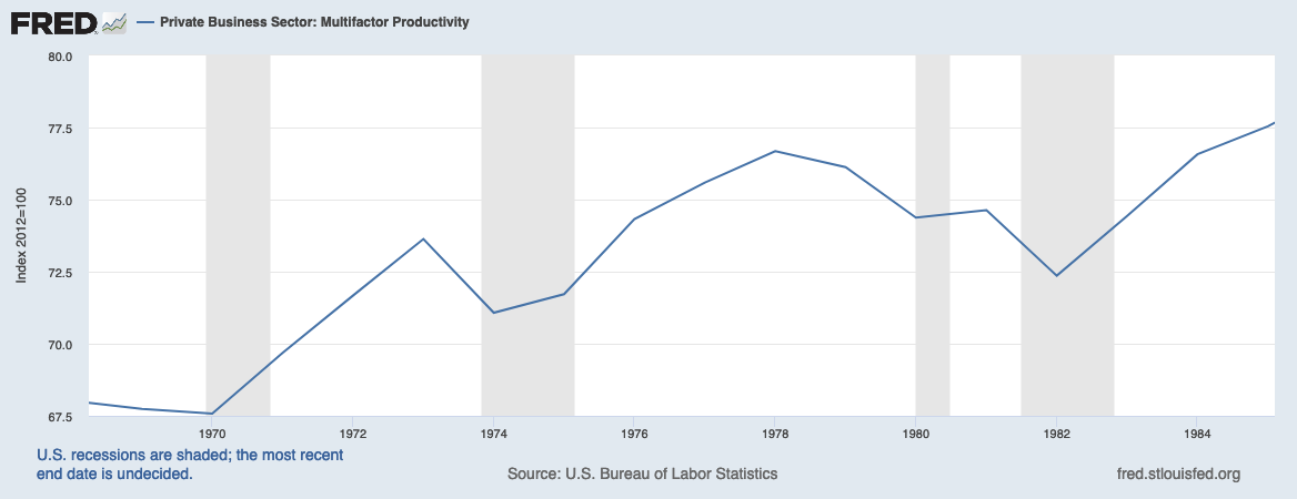 Eux sont dans un mouvement assez opposé à la productivité. À comparer avec les prix à la consommation, dont la progression a été beaucoup plus régulière depuis les années 1980 : https://fred.stlouisfed.org/series/CPIAUCNS