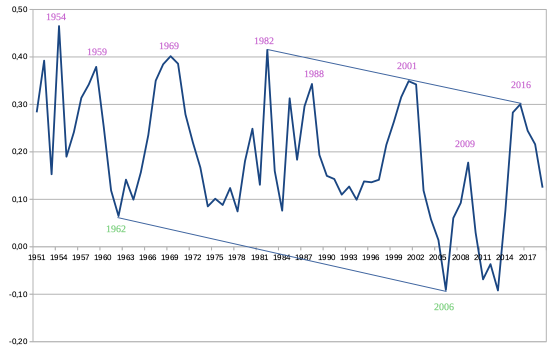Ce graphique compare l'évolution d'année en année (en moyenne centrée sur 5 ans) du taux de profit et du chômage. En rouge, le chômage.
