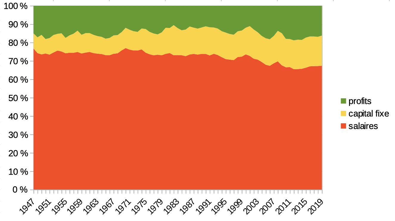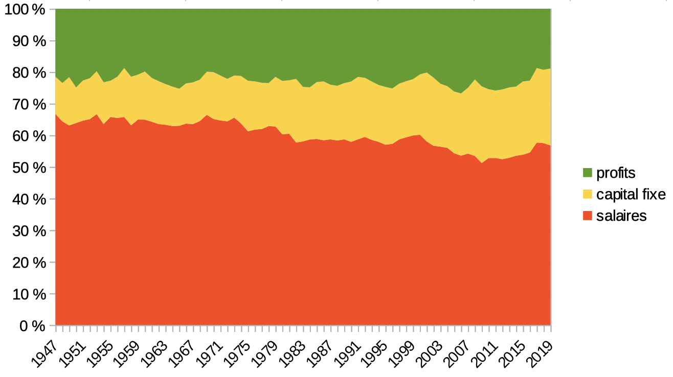 Dans l'ordre : les années 1980 voient un creusement de la part des profits correspondant à un transfert vers les dépenses en capital fixe, puis à partir du milieu des années 1990 la part des profits remonte (non sans mal), ce qui se traduit par une réduction de la part des salaires.