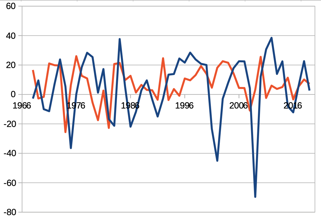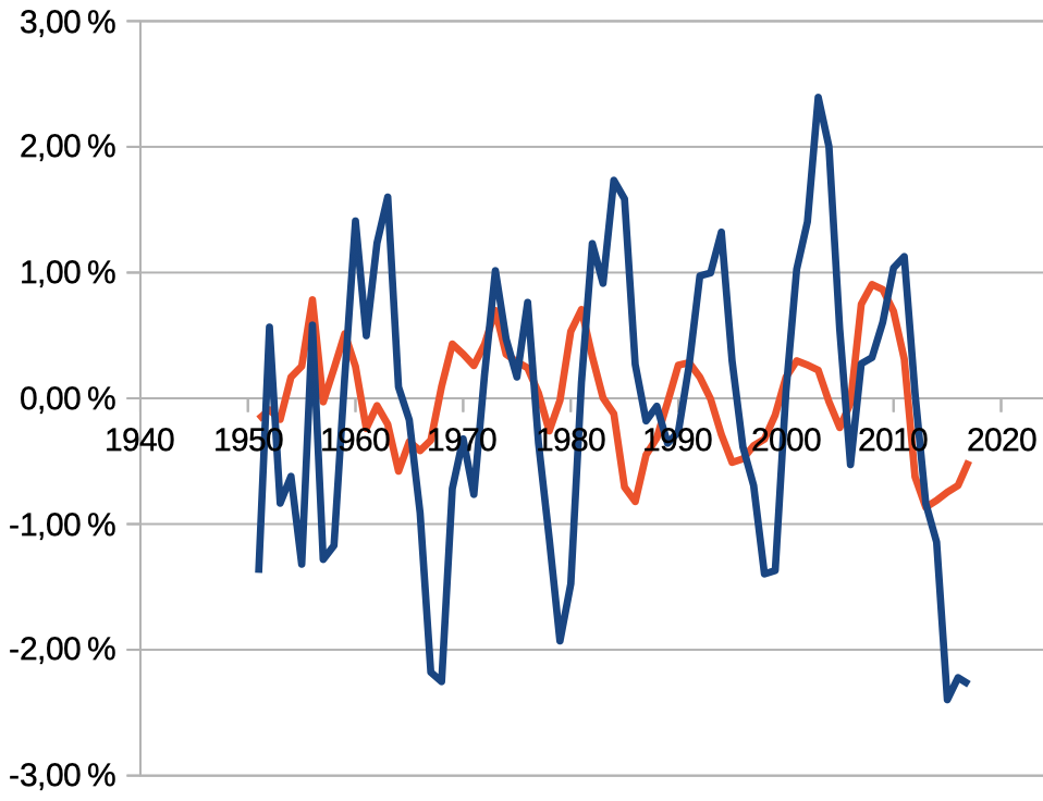 En rouge, le changement de la productivité (indice multiplié par 10), en bleu celui du capital constant employé.
