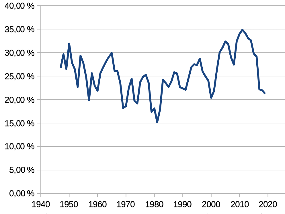À partir de 2012, le taux de profit a entamé un plongeon d'une durée et d'une profondeur (de 35 à 21 %) inconnues jusqu'alors depuis l'après-guerre.