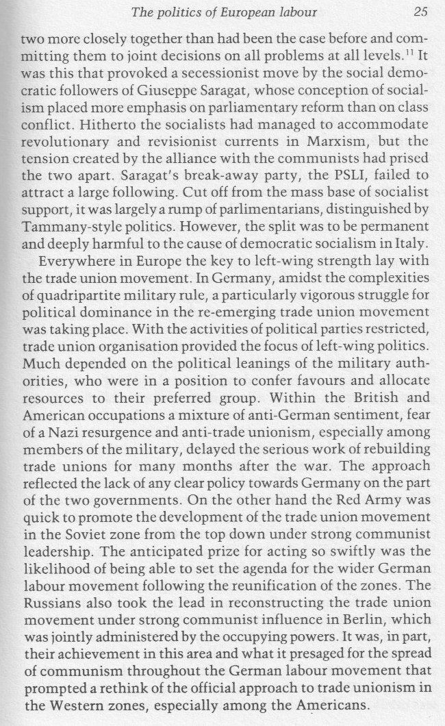 8. Modération salariale elle-même due à l’afflux de travailleurs qualifiés, notamment d’Allemagne de l’Est, mais aussi à la refonte des institutions syndicales par les forces occupantes (de grandes centrales syndicales bien délimitées selon les secteurs industriels, à même de coordonner efficacement le militantisme ouvrier) qui, combinée à partir des années 1950 à un investissement productif dans un contexte de non-réarmement, a favorisé un partenariat avec le patronat [la méfiance réciproque a dominé peut-être jusque dans les années 1960 – voir Anthony Carew (1987), Labour under the Marshall Plan, p. 222], c’est-à-dire une augmentation de la productivité rendue payante par l’accès à un marché étendu – dans un contexte de réduction des barrières douanières. Wendy Carlin, West German growth and institutions, 1945-90, in Economic growth in Europe since 1945, 1996, pp. 466-7 ; Peter Gourevitch, Politics in hard times, comparative responses to international economic crises, 1986, pp. 169-72.
