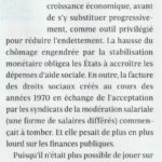 Quand en 1981 la France opte pour une nouvelle relance de la consommation, à contre-courant de l’impulsion donnée par les États-Unis, l’effet de la hausse des prix se fait ressentir sur la compétitivité de ses exportations, d’autant plus que la somme totale des importations dans le monde est faible dans ce contexte de rigueur désinflationniste [pourtant une hausse de la consommation signifie une baisse de l’épargne et donc un moindre besoin d’exporter si l’investissement ne diminue pas]. La fin de l’indexation des salaires en 1982 annonce le changement de cap décidé par le président Mitterrand – bien qu’elle ait pu être vue comme une façon de favoriser l’embauche. Désormais les travailleurs ont bien moins de raisons de se satisfaire d’une croissance reposant sur l’inflation. La France reste dans le Système Monétaire Européen, créé en 1979 (modification du Serpent Monétaire Européen initié en 1972), et le franc doit donc s’aligner sur le deutschemark, une des monnaies les plus fortes de l’après-guerre [cette parité assurée n’incite pas à la spéculation sur les taux de change, et réduit donc le volume des réserves nécessaires pour la défense du franc]. L’Allemagne s’est appuyée sur une inflation très faible elle-même obtenue par la modération salariale[8] : la compétitivité à l’exportation – notamment de ses biens d’équipement* – en est renforcée, et en contrepartie les produits d’importation sont davantage accessibles aux consommateurs. Pour suivre le cours de la devise allemande[9], les pays partenaires sont poussés à tolérer un niveau de chômage élevé.