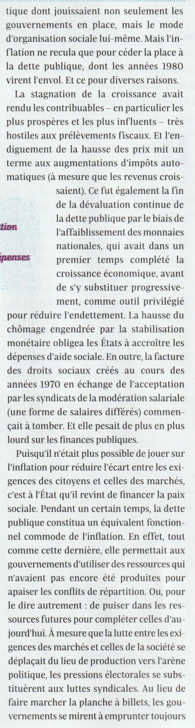 Depuis le milieu des années 1980, simultanément à l’essor des investissements internationaux, l’inflation dans les pays riches s’est stabilisée malgré la baisse des taux d’intérêt. Après les attentats du 11 septembre 2001, la Fed maintient les taux d’intérêt à un niveau très bas jusqu’en 2004 par crainte d’une baisse de la confiance des investisseurs et des consommateurs. Et pourtant l’inflation n’apparaît pas [en tout cas dans les mesures officielles ; le prix du pétrole grimpe avec les conflits au Moyen-Orient ou encore au Nigeria], en partie parce que le prix des biens de consommation est contenu par les exportations massives de la Chine, qui même si elle a vu sa monnaie s’apprécier à partir de 2005, a délibérément maintenu ses taux d’intérêt réels en dessous de zéro, retirant ainsi de la capacité à consommer à ses ménages, épargnants nets (depuis les crédits à la consommation se sont largement développés en Chine). Les dollars qu’obtient la puissance asiatique sont réinjectés dans l’économie américaine et viennent alimenter la bulle de crédit qui éclate en 2007. En 2014, la Banque Centrale Européenne craint que l’inflation ne diminue trop – alors que les taux d’intérêt sont déjà très faibles. Elle cherche alors à injecter des liquidités, par exemple par l’achat de titres adossés à des actifs – ce qui doit pousser les banques à prêter davantage. Songeons qu’avec le niveau actuel des dettes publiques, en partie dû au sauvetage des banques lors de la dernière crise financière, les marchés hésitent à cautionner les politiques d’austérité vues comme trop strictes pour relancer l’économie.