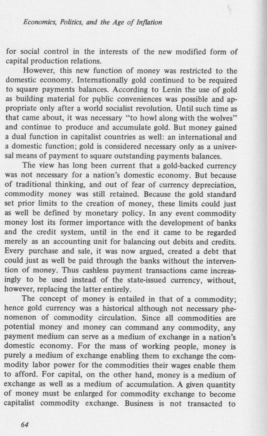 5. Une dévaluation réduit le pouvoir d’achat domestique et laisse davantage de production disponible pour l’exportation, avec une compétitivité accrue par la baisse relative des prix pour les étrangers. Dans le cas des États-Unis (premier marché mondial de biens de consommation), une baisse de la demande domestique revient à une réduction de la demande globale. Une raison pour l’Europe des années 1970 de dévier le trafic de drogues vers chez elle… et aussi de laisser s’exprimer révolte et terrorisme. Une dévaluation peut avoir pour effet d’amener des investisseurs de l’étranger pour profiter de la meilleur compétitivité, ce qui pousse à l’appréciation de la monnaie. Le cours du dollar chute de la fin de Bretton-Woods au tournant des années 1980, mais moins que celui de la livre sterling. Concernant l’exportation de l’inflation américaine : les afflux de capitaux vers les pays à monnaie forte y provoquent une inflation qu’il n’est pas possible de stériliser par la vente d’obligations en l’absence d’un marché financier domestique développé, ce vide étant le fait du contrôle sur les flux de capitaux (qui bénéficie en revanche à l’intermédiation bancaire) – les mesures de contrôle sur les capitaux contribuent-elles malgré tout à limiter la pression inflationniste ? La stérilisation de l’inflation par l’achat d’or fait courir le risque d’une réaction états-unienne (au contraire on en vend), et on craint qu’une réévaluation de la monnaie nationale (pour faire baisser le prix des produits d’importation) soit vue comme le signal d’autres réévaluations à venir, et attire donc davantage de capitaux (et notamment en provenance d’outre-atlantique). Seuls l’Allemagne et les Pays-Bas procèdent à des réévaluations notables dans les années 1960 (avec pour incidence une plus forte inflation chez leurs partenaires commerciaux, où la concurrence s’aligne sur les nouveaux tarifs). L’inflation américaine de la période était en général plus faible que dans les autres pays industrialisés, possiblement parce que la perte de valeur du dollar est limitée par la politique doublement inflationniste de ses partenaires commerciaux : il s’agit d’une part de se ménager des profits, et de l’autre d’être compétitif avec une monnaie plus faible. Le déficit US est comblé par des emprunts publics servant à mettre en activité les capitaux domestiques inemployés, avec pour effet de réduire le taux de profit (les ‘nouveaux’ profits sont extraits des capitaux ainsi remis en circulation, il ne s’agit pas d’une accumulation). Mais tant que la production s’étend grâce à la demande artificielle, on peut y contrevenir en procédant à une augmentation des prix. Les politiques monétaires inflationnistes, contenant en germe de potentiels profits, sont un bon argument pour une hausse des dépenses publiques. Voir Paul Mattick, Economics, politics, and the age of inflation.
