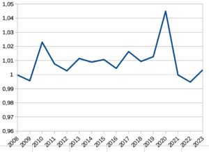 On constate que depuis 2012, la productivité mondiale du travail semble s’être stabilisée autour de 1 %. Le capital est-il devenu conscient ? Bon, ce jeu de données n’a pas été mis à jour depuis le Covid. Des statistiques plus récentes sur la quantité de travail sont disponibles auprès de l’OCDE (pour ses pays membres), et montrent un pic à plus de 4 % en 2020 (logique vu que seuls les travailleurs ‘essentiels’ ont été autorisés à se rendre au turbin pendant les confinements), suivi d’une croissance nulle puis négative de la productivité en 2021 et 2022. En 2023 les gains de productivité étaient à peine positifs.